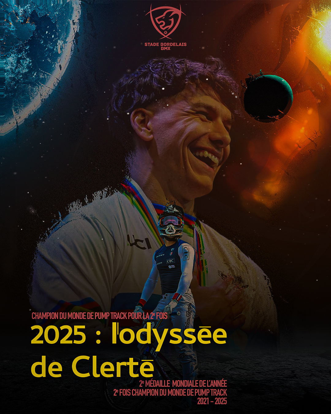 Le BMX français (et surtout bordelais) est sur orbite en cette année 2025 ! Je vous remet dans le contexte : le 3 août dernier, nos 2 pilotes, Eddy CLERTÉ et Joris DAUDET signent une performance stratosphérique : 2 français dans les 4 meilleurs pilotes du monde, avec une superbe médaille de bronze pour Eddy. Du jamais vu dans la galaxie du BMX. Eh bien ce dimanche 7 septembre, Eddy a décidé que 2025 ne s’arrêterait pas là dessus !