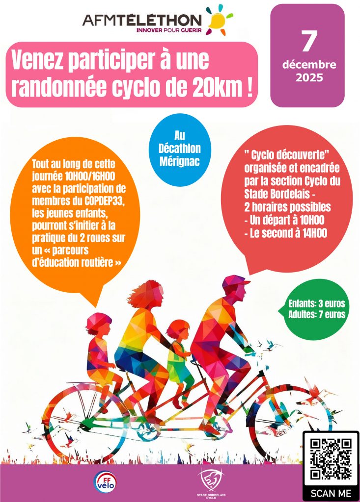 Dans le cadre de la 39ème édition du Téléthon 2025, ce dimanche 7 décembre 2025, au sein du village Décathlon de Mérignac, la Section Cyclo du Stade Bordelais vous convie à participer à une randonnée cyclo découverte.